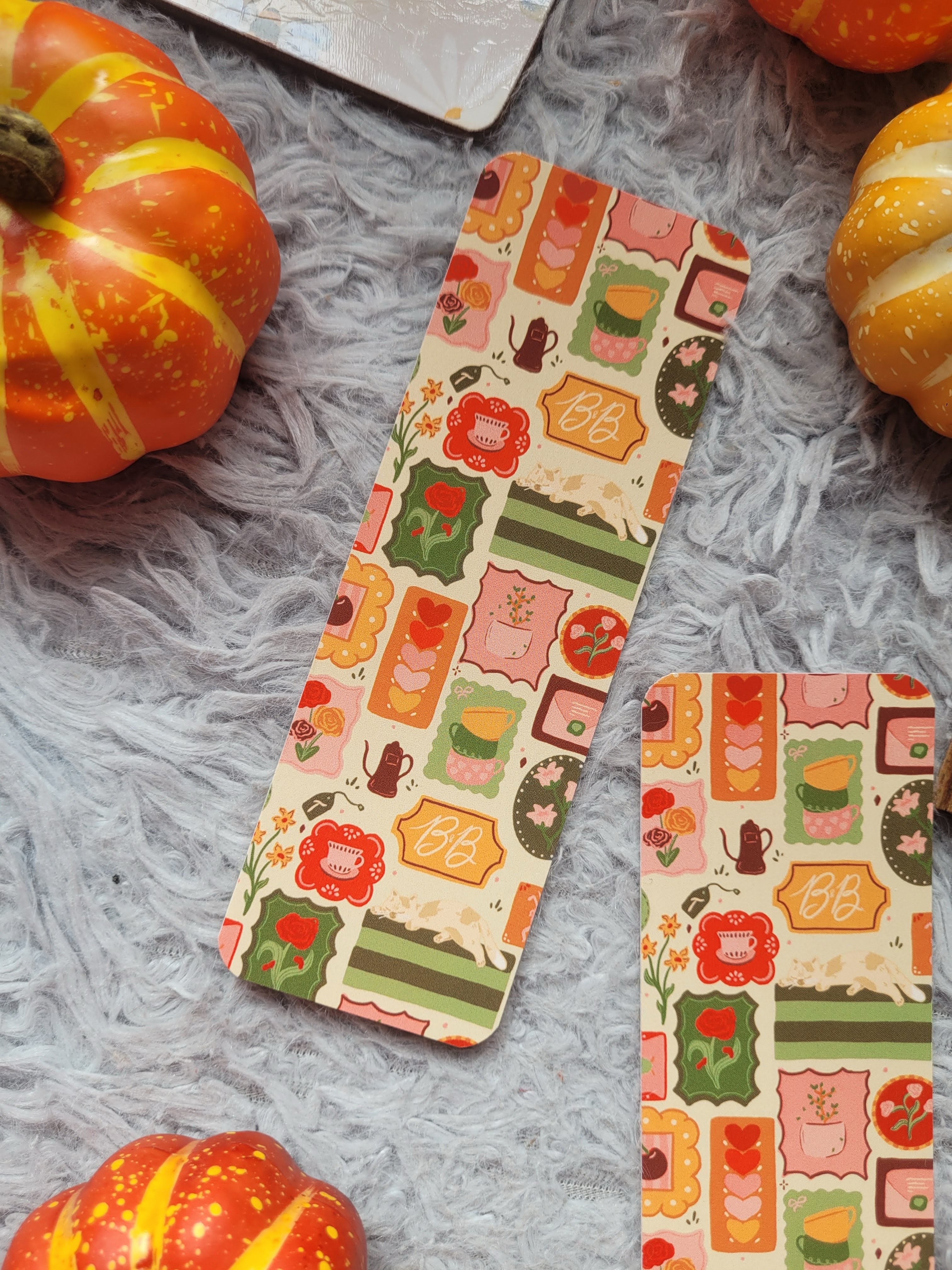 This cozy autumn bookmark features an adorable stamp-style pattern filled with seasonal details—warm drinks, pumpkins, florals, and soft earthy tones that capture the magic of crisp days and cozy nights. It’s designed to feel like your favourite sweater, a hot cup of tea, and a quiet moment with a good book.