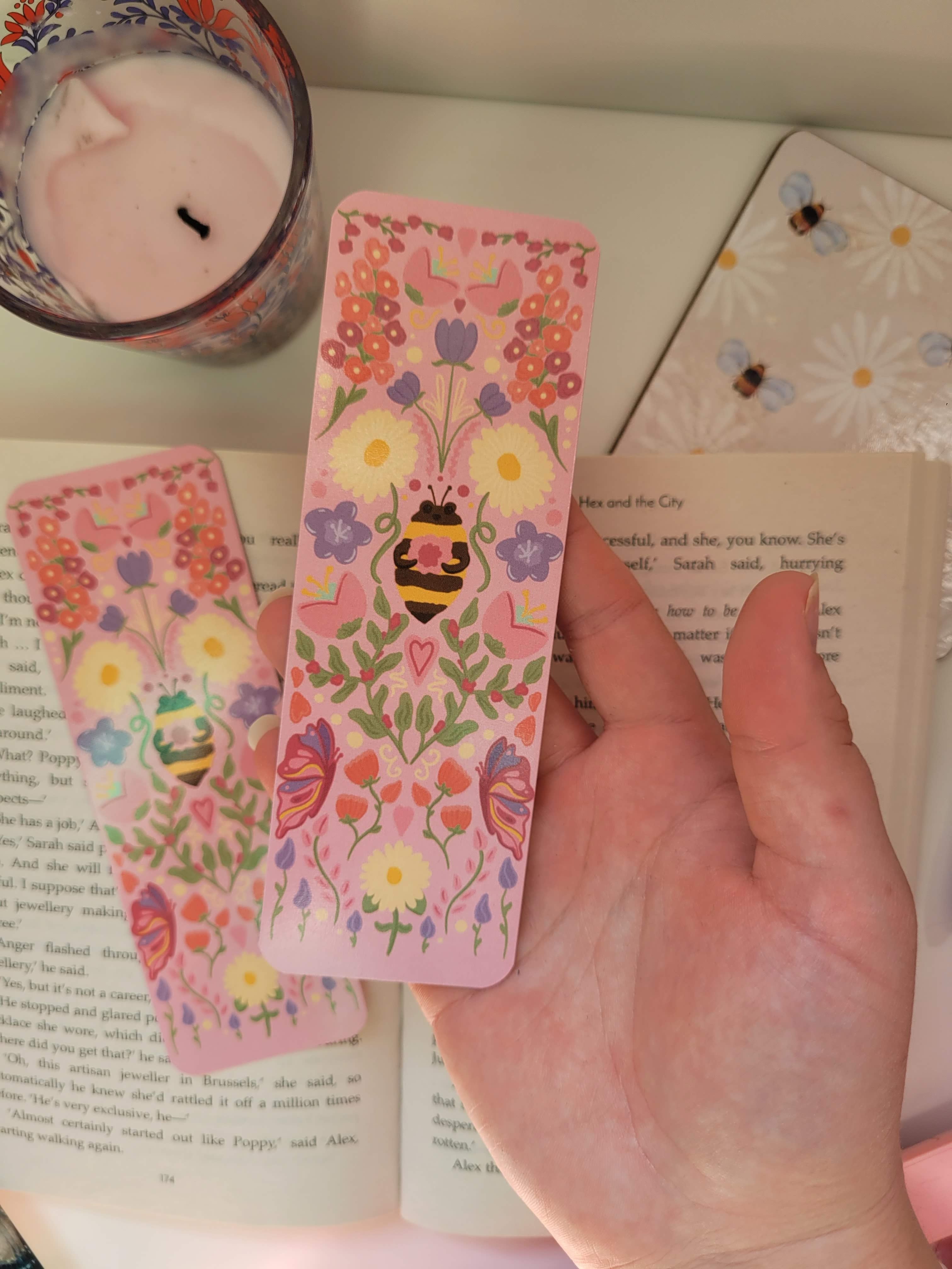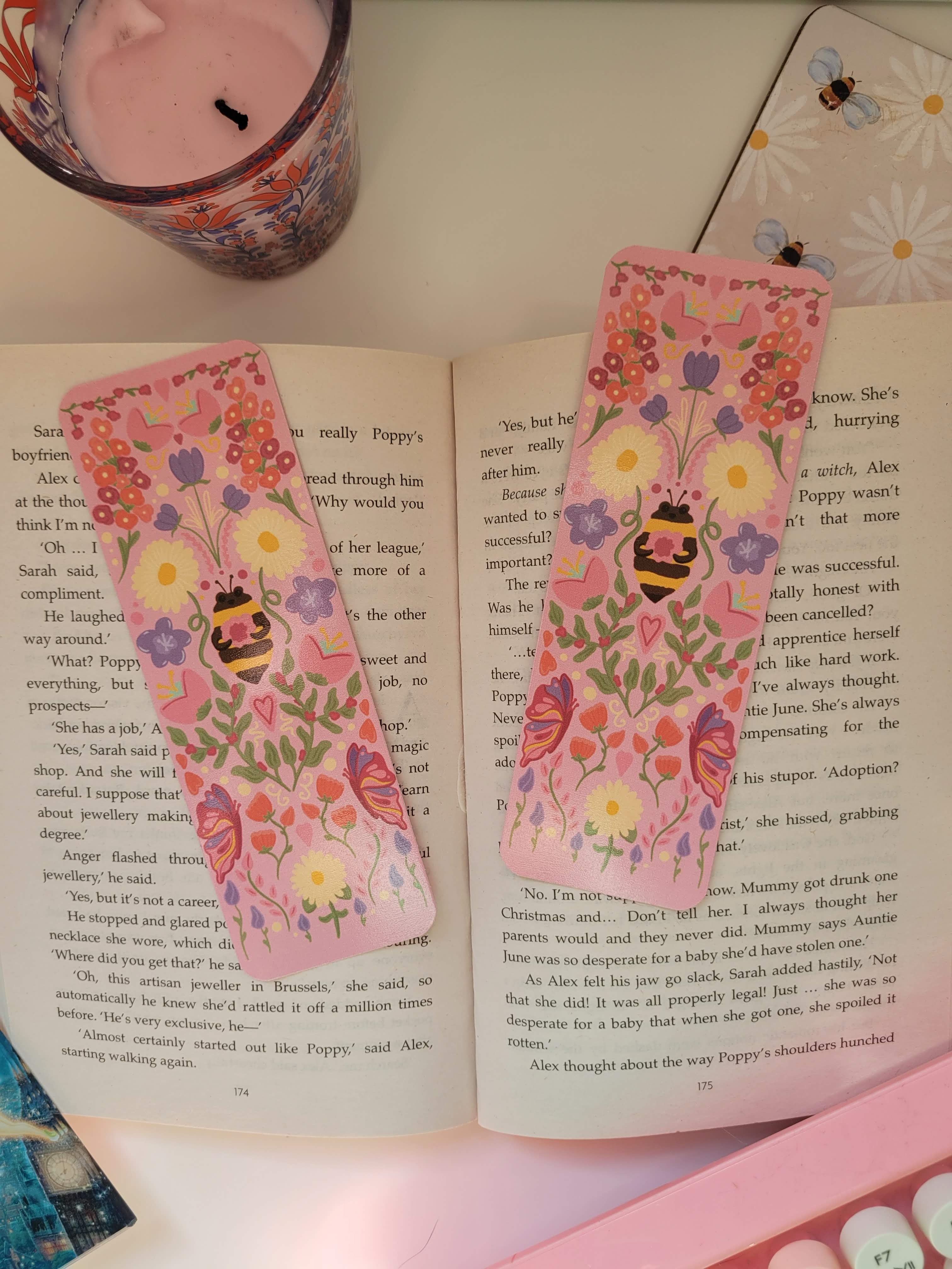 Bring a touch of nature's beauty to your reading with the "Bloom and Blossom" Bookmark, a delightful accessory that combines elegance and functionality. This double-sided bookmark features intricate illustrations of bees, butterflies, and flowers, perfectly symmetrical to create a harmonious design. The soft pink background with pastel hues gives it a gentle, calming feel—perfect for any book lover who appreciates both style and charm.