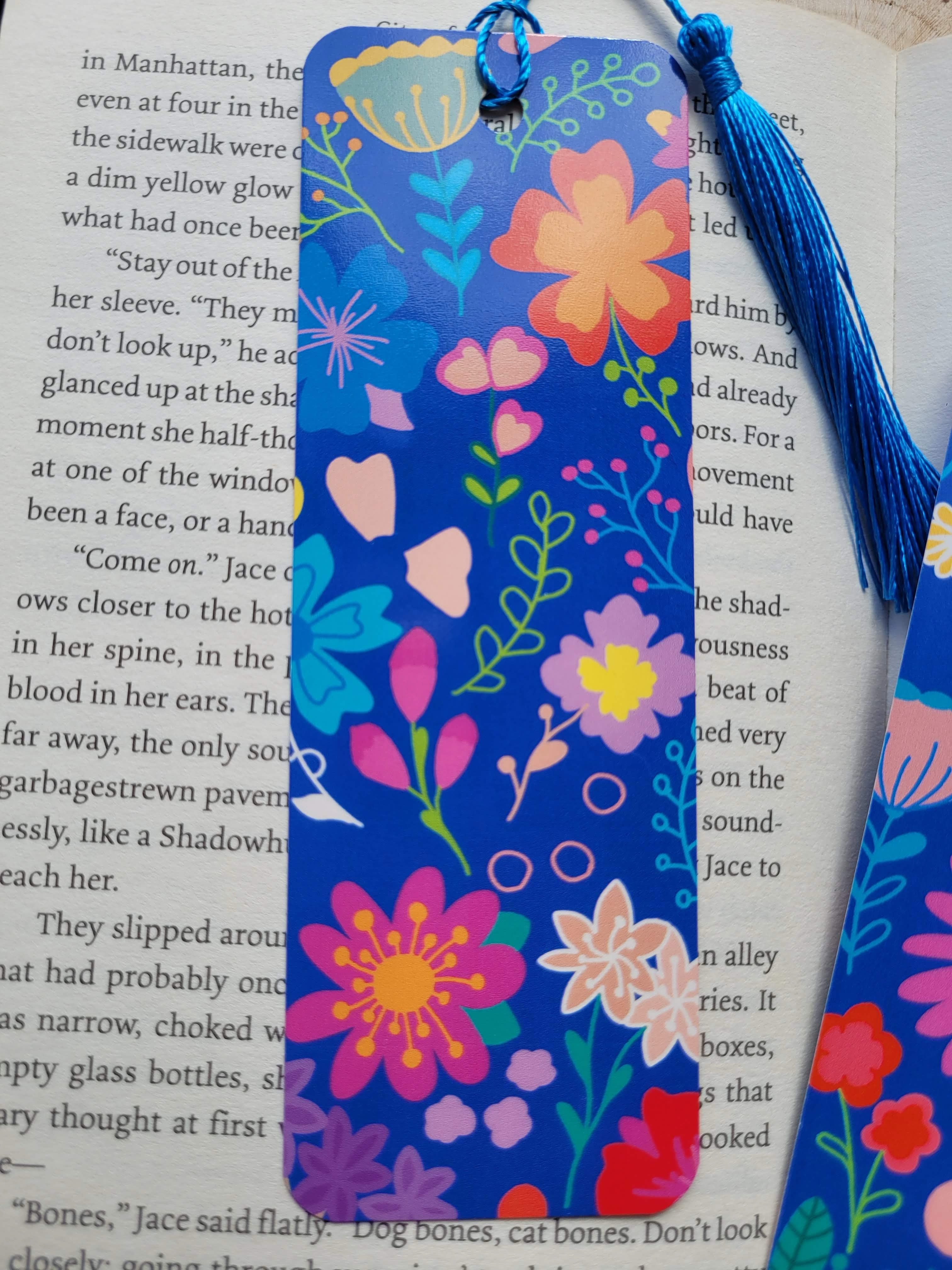 This floral inspired bookmark is the perfect accessory for all you book lovers and readers. Colourful floral design and pattern on a dark blue background. Designed by myself and turned into a lovely bookmark which is the perfect size to fit into all your books without being damaged.
