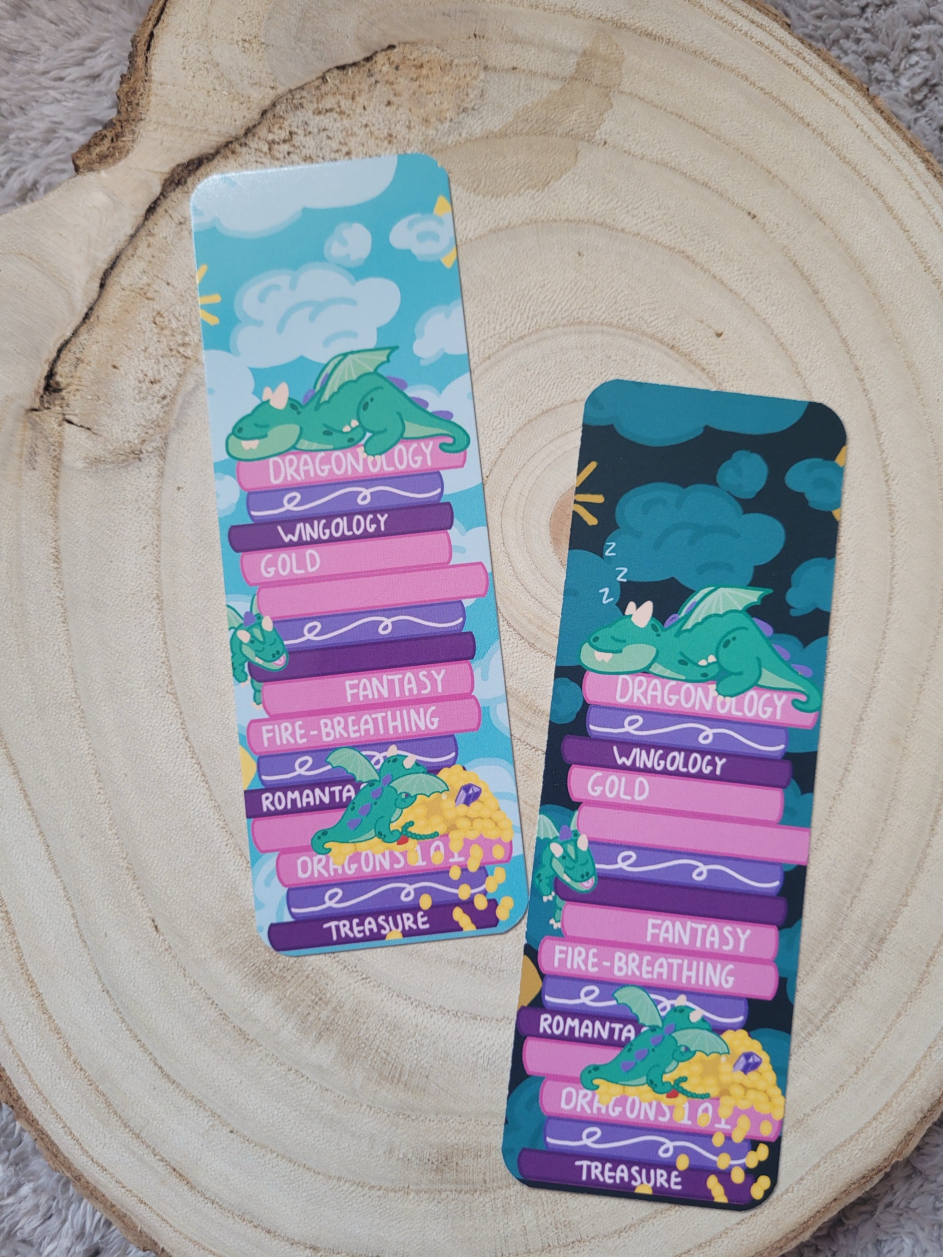 This cozy double-sided dragon bookmark features an adorable sleeping dragon curled up on a stack of magical books, surrounded by soft clouds and dreamy fantasy details. With two beautifully illustrated sides—one bright and whimsical, the other deep and midnight-toned—it perfectly captures both daytime reading and late-night bookish escapes.