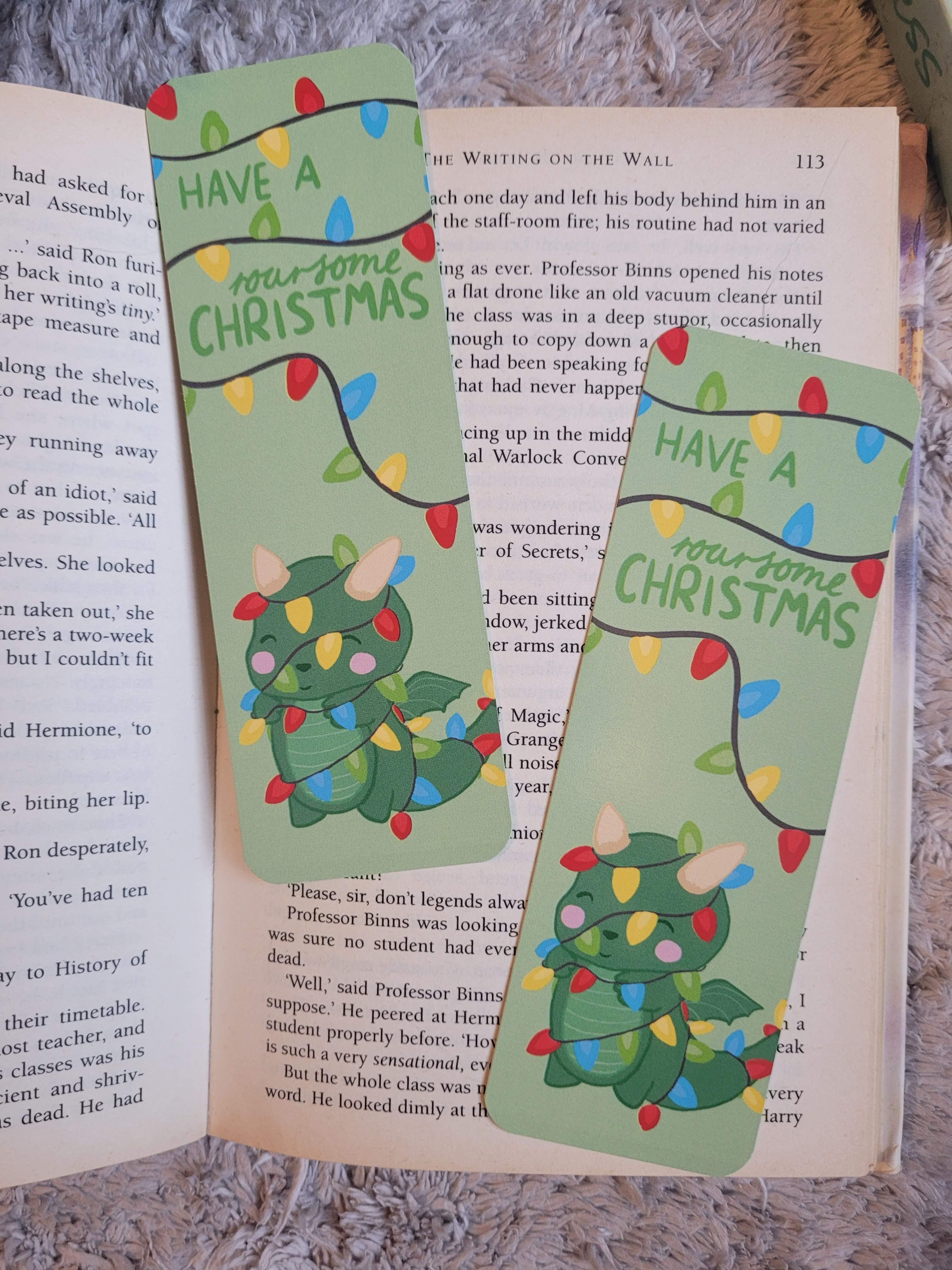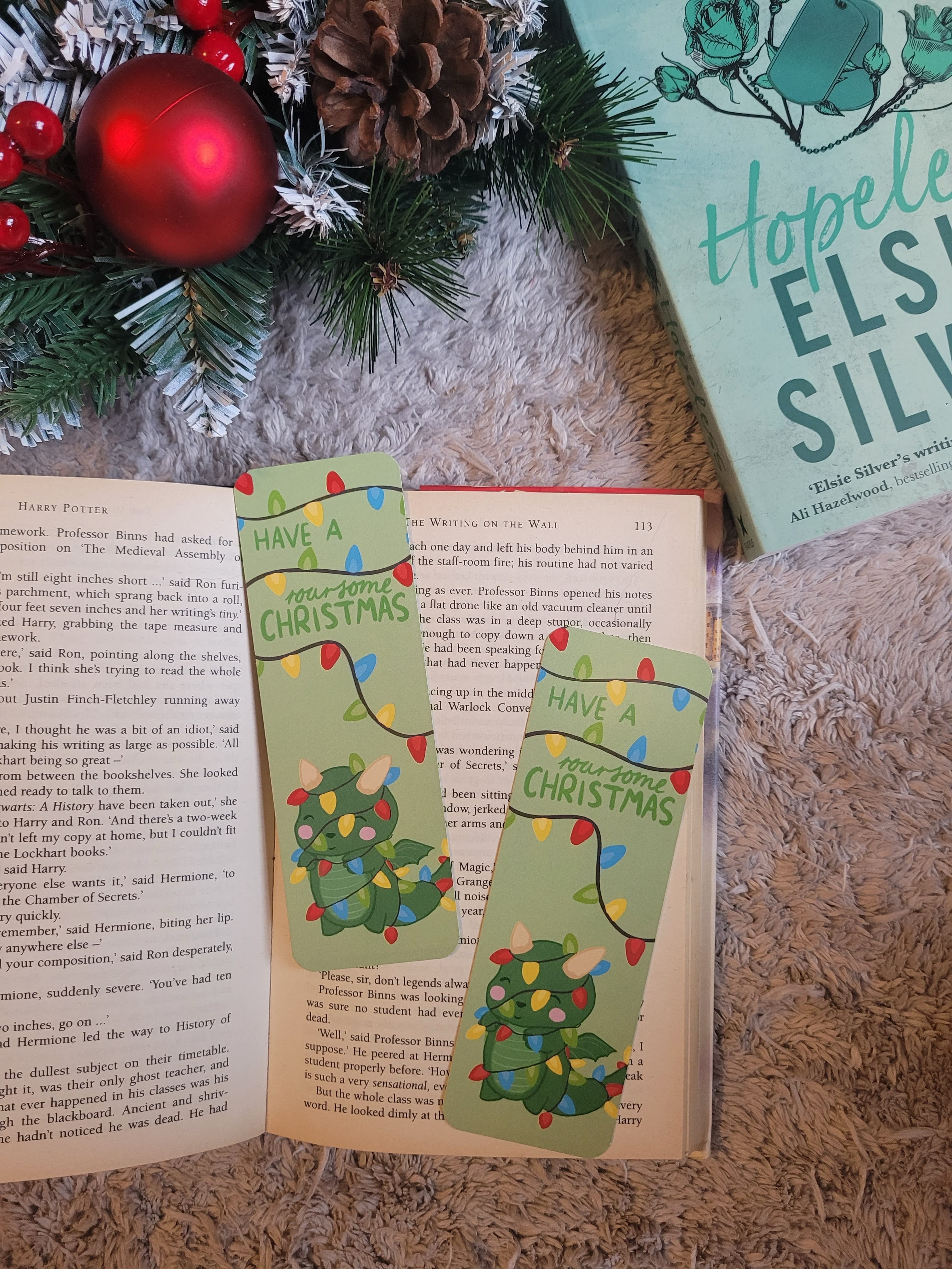 This little fellow is lighting up your books this Christmas. Tangled in his Christmas lights, he wishes you a roarsome Christmas this year. Open your book to this little cutie every time you read and have a very merry Christmas.