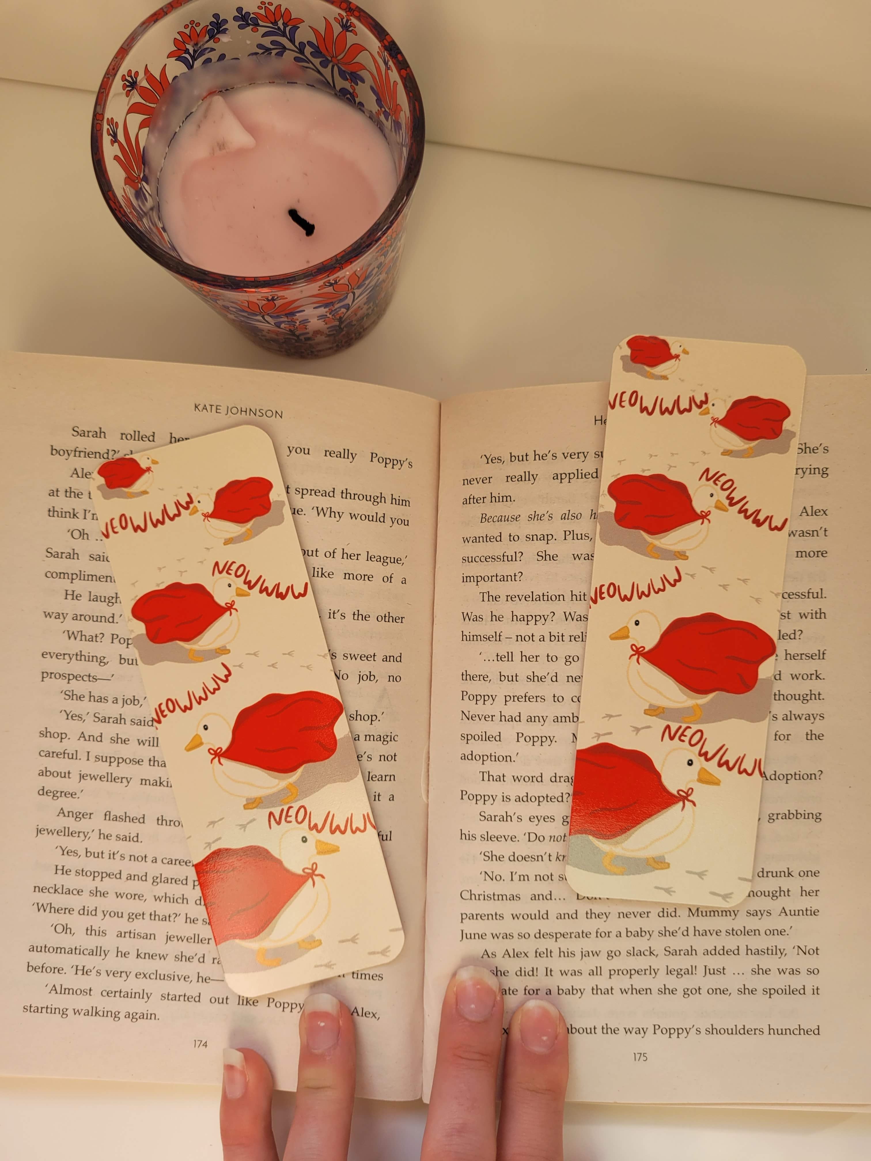 Get ready to save the day with Ducky in his superhero cape! This whimsical bookmark features a little duck that grows in size as he zooms towards the end, shouting his signature "Neowww!" along the way. Set against a clean white background, Ducky is here to bring some much-needed fun and heroic energy to your reading experience.