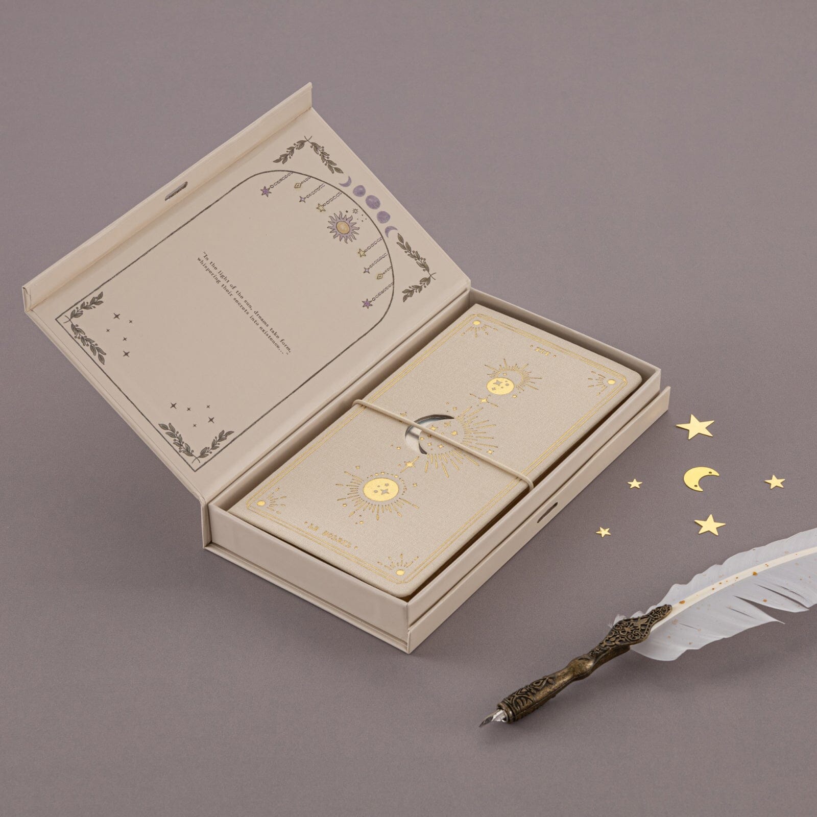 Enjoy a lunar calendar, a step-by-step guide to manifestation, and a dedicated moon manifestation log - all thoughtfully curated for our witchcore enthusiasts. Plus, with 120 pages of dot grid paper, you’ll have plenty of room to let your imagination soar and bring your magical visions to life. Wrapped in soft cream linen, adorned with gold foil details, + a window cutout, stored in a special edition gift box.