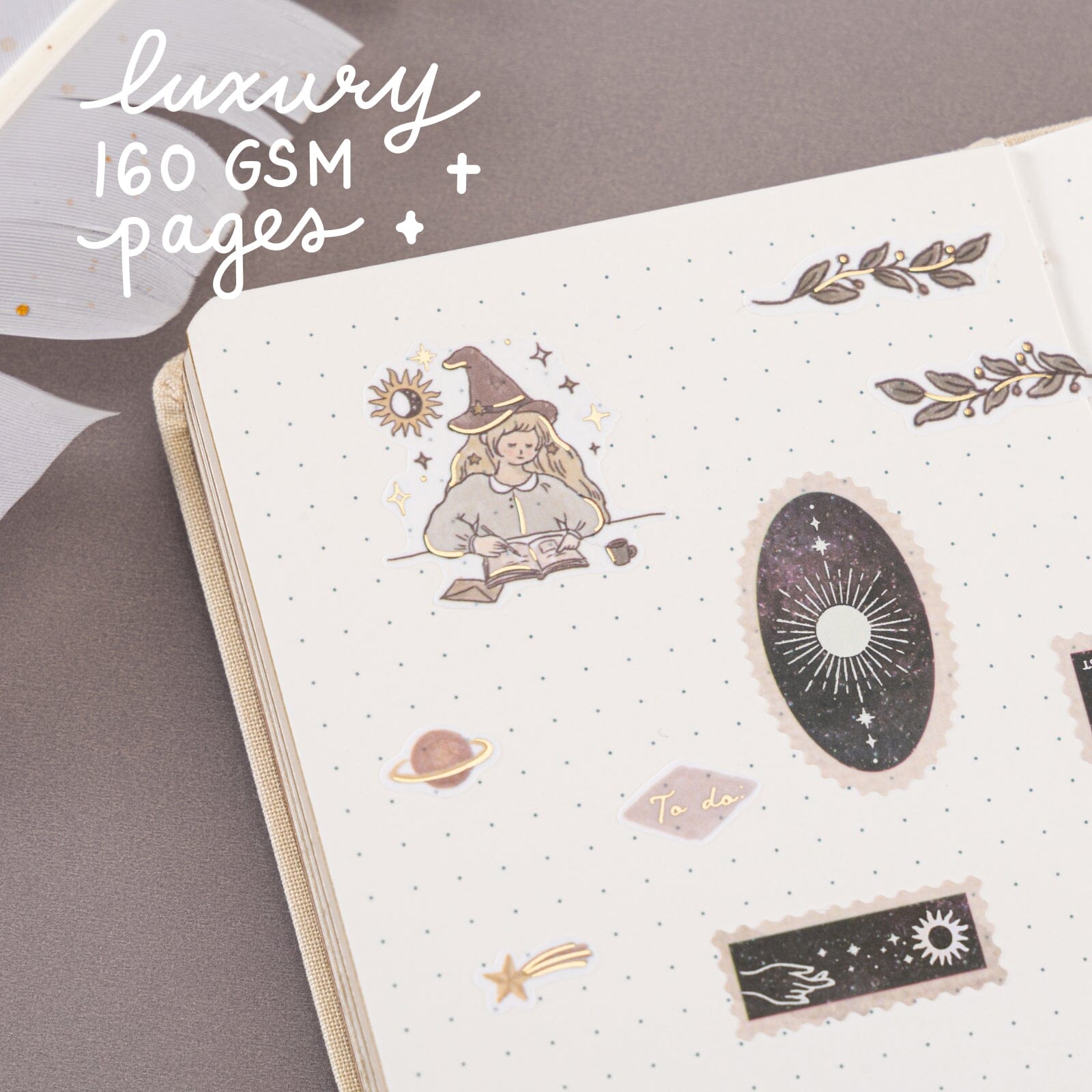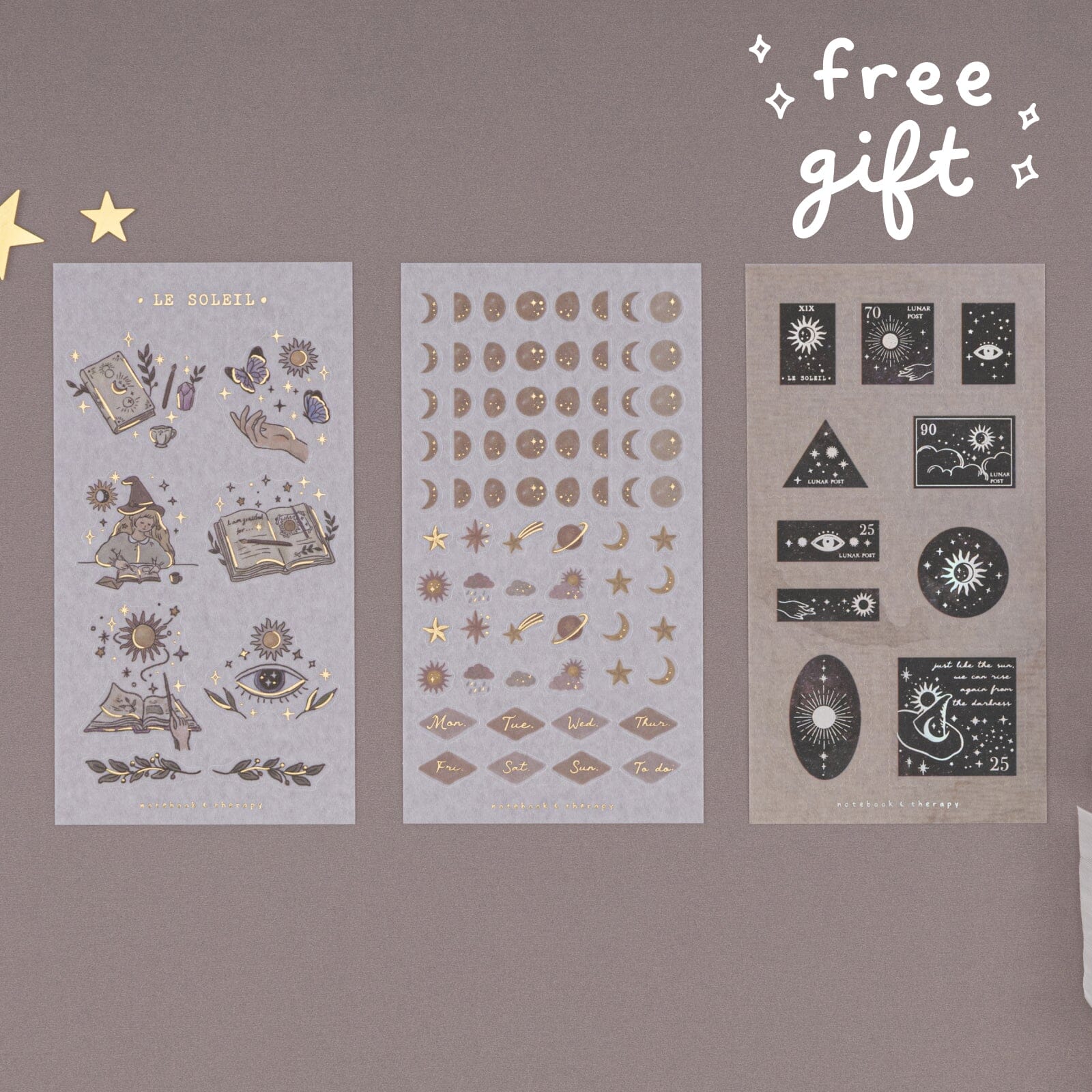 - 3x witchy stickers with gold foil details at the bottom of box