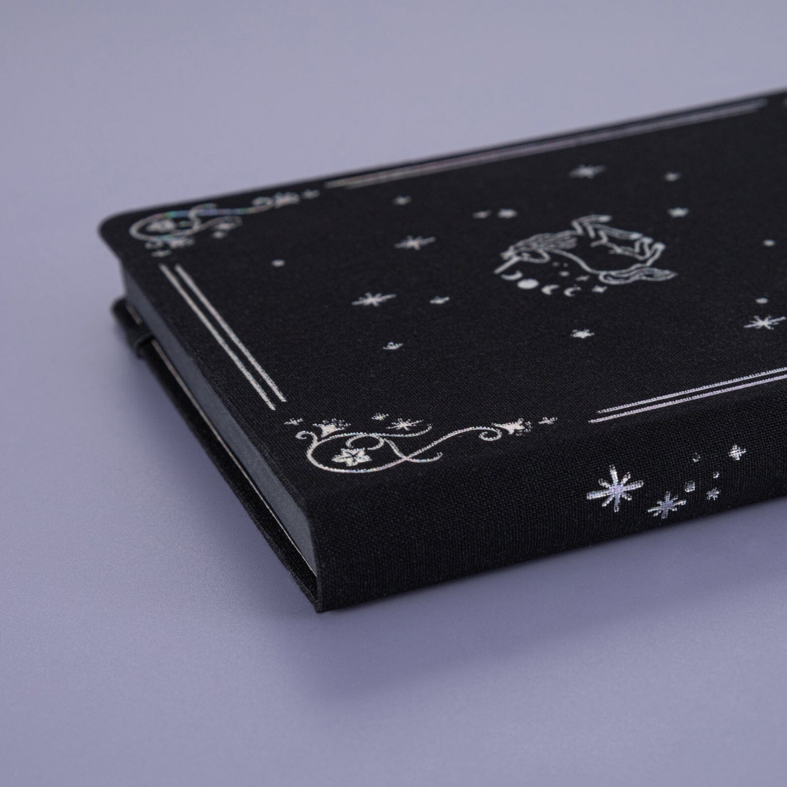 Celebrate Halloween and write down your positive affirmations and favourite spells + manifest your dreams with the magic of the moon in this stunning black-page bullet journal! Get that mysterious + magical look for your bullet journal spreads with the black dotted pages. Wrapped in a black linen fabric with a magical unicorn design + celestial accents in black + holographic silver foil.