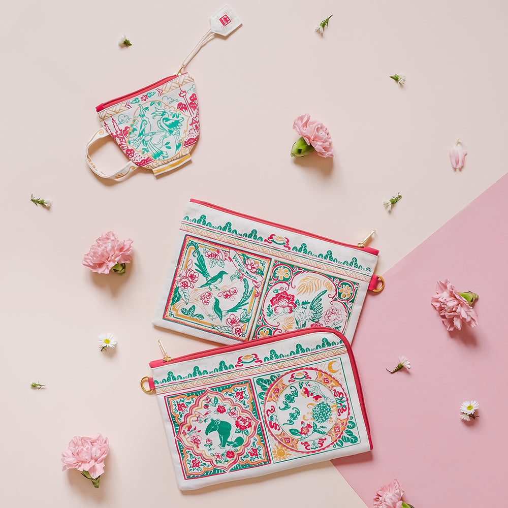 Here are four of our favorite native fauna on Peranakan tile-inspired designs; The Ayam Serama, Tapir, Kelawar, and Burung Murai! We paired this pouch with our original grill pattern lining, giving it a cute pop of contrast on the inside.