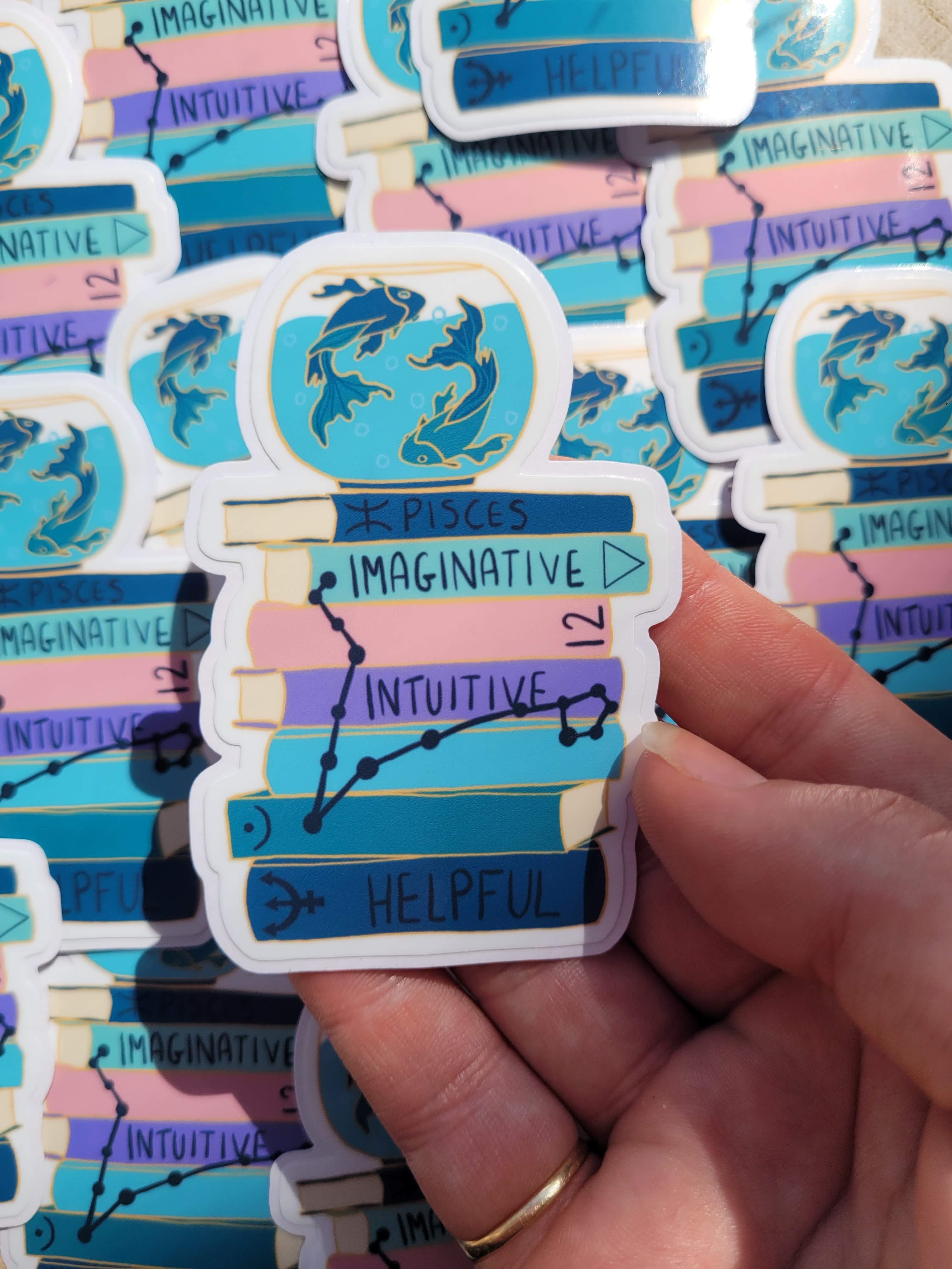 As part of my zodiac collection, I have designed a Book stack in the colours of each zodiac sign to represent each star sign and their love of reading. Each stack has 3 words that describe the personality of said zodiac sign along with their ruling house and planets and which element they belong to.