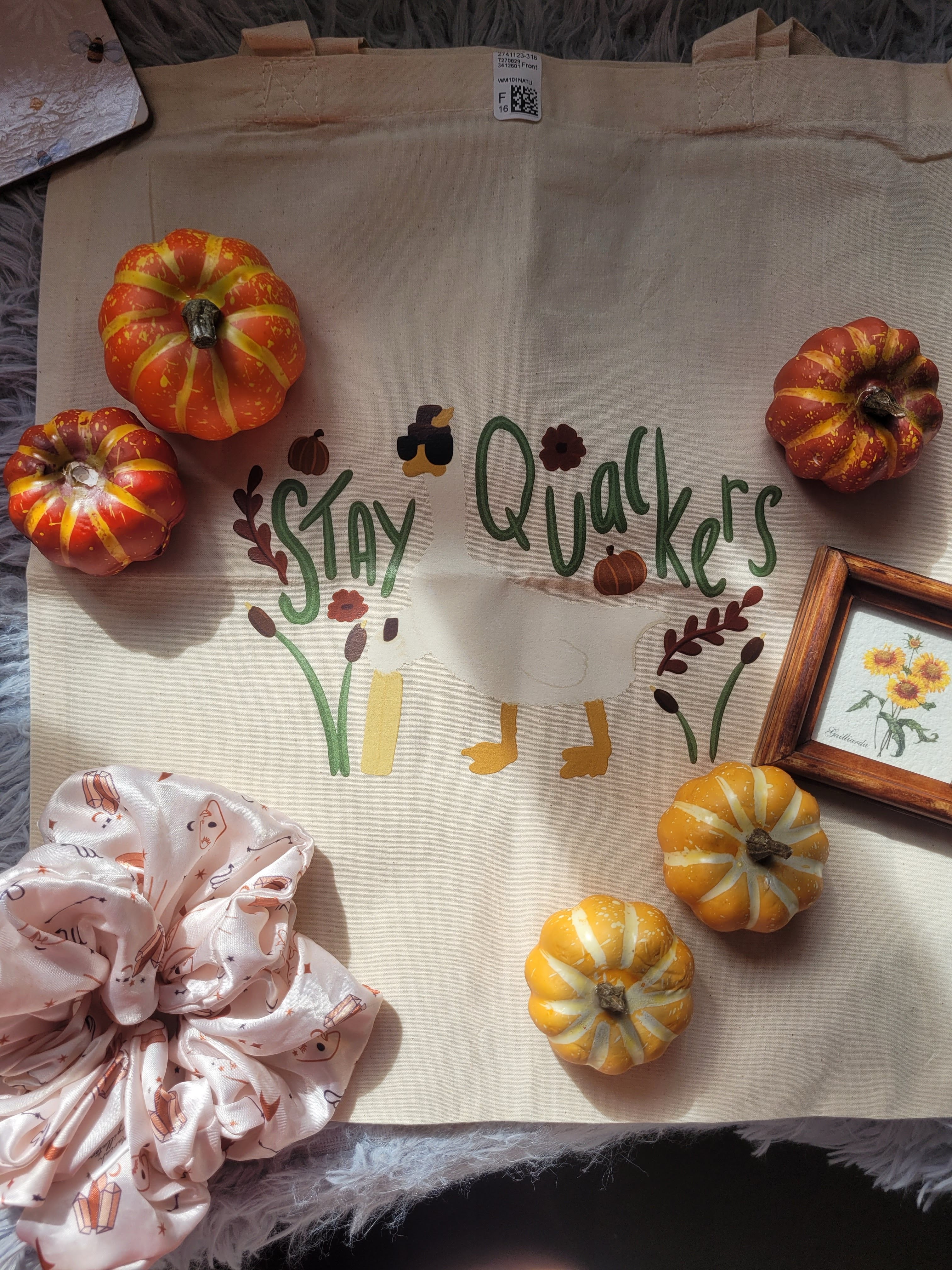 The tote is brought to life with autumn-inspired illustrations of pumpkins and red flowers, giving it warm, fall vibesperfect for the season (or year-round coziness).